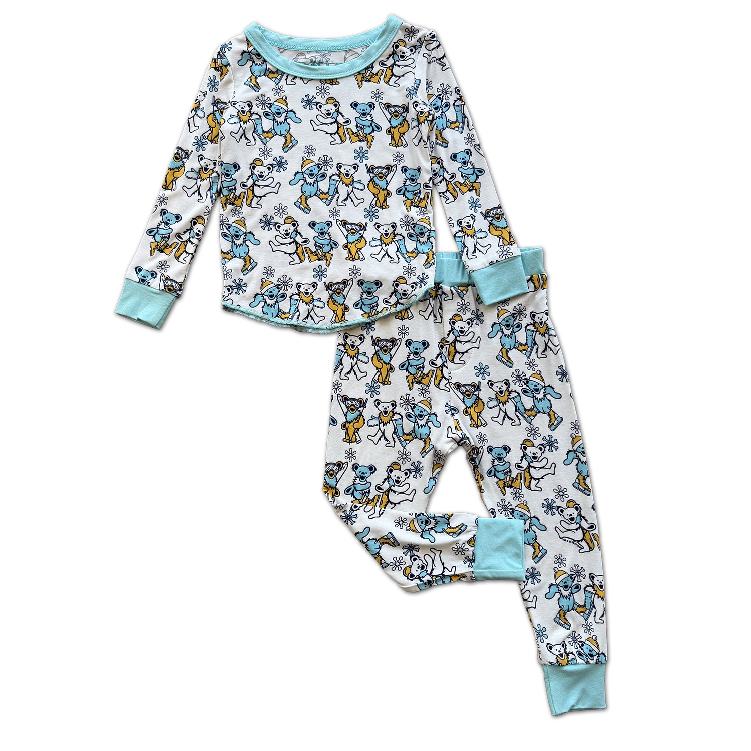 Let your little one drift off to dreamland in style with this whimsical Rowdy Sprout pajama set featuring adorable snow bears and iconic Grateful Dead vibes. Crafted from soft, cozy fabric, the long sleeves provide warmth through chilly nights while the playful blue design keeps bedtime fun and exciting. Perfect for kids who love a touch of retro cool mixed with cuddly comfort. Sweet dreams guaranteed! Bamboo.