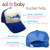 With its vibrant design and practical features, the Sol Baby Blue Stripe Shark Trucker Hat is the perfect combination of fun and functionality, making it a must-have for young adventurers everywhere.