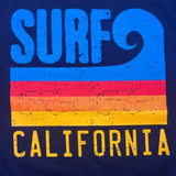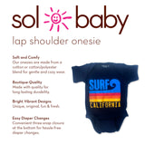 Introducing the Super Cool Sol Baby Surf California Wave Stripe Navy Bodysuit – a vibrant nod to retro surf culture! Crafted with inspiration from 70's vintage surf tee aesthetics, this Sol Baby original design features a perfectly distressed graphic on a soft navy blue lap shoulder one-piece. Printed locally with safe, non-toxic ink, it's not just stylish but also safe for your little one.